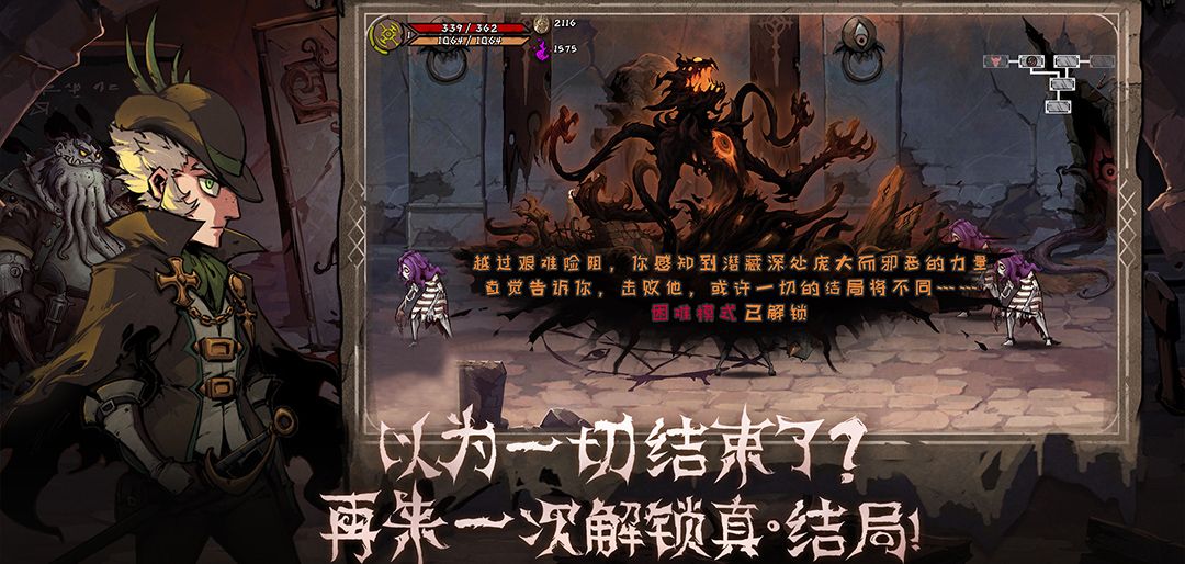 当玩家作为游戏中的调查员通关了一次原剧情模式(现简单模式)后,困难模式将会解锁。这将是一个全新的旅程,其最大难度甚至要高于疯狂爬塔的无尽模式。