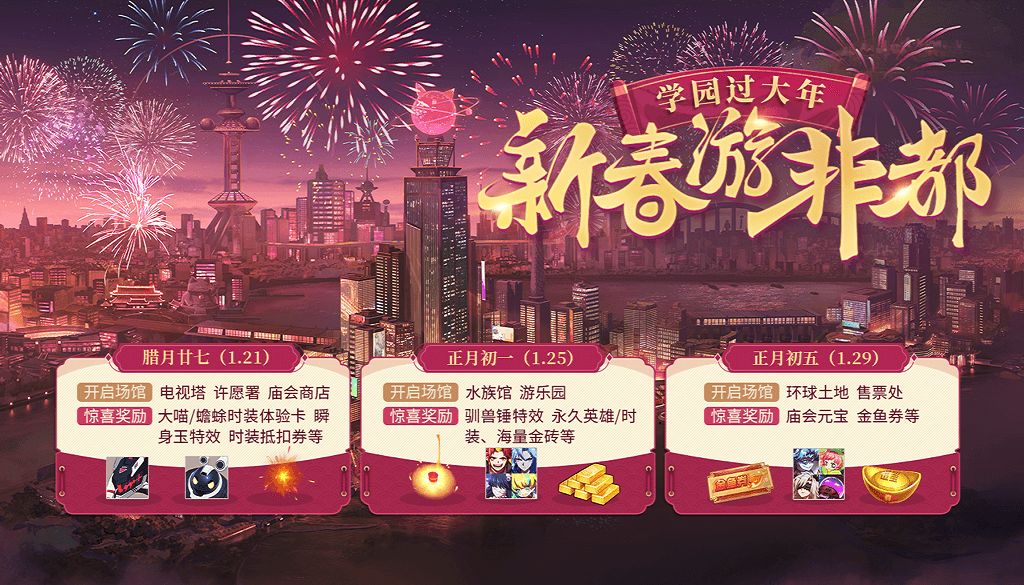 你可曾游历过夜晚的非都?烟火漫天,流光溢彩,新年的喜悦在城市中肆意飘洒!华灯初上,霓虹闪烁,节日的幸福洋溢在每一位市民的眼角眉梢。《非人学园》鼠年新春特别活动“新春游非都”正式开启!活动期间,许愿署、水族馆、游乐园等场所均会陆续开放,五光十色的趣味玩法,琳琅满目的特色奖励,伴你欢度这个寒假!