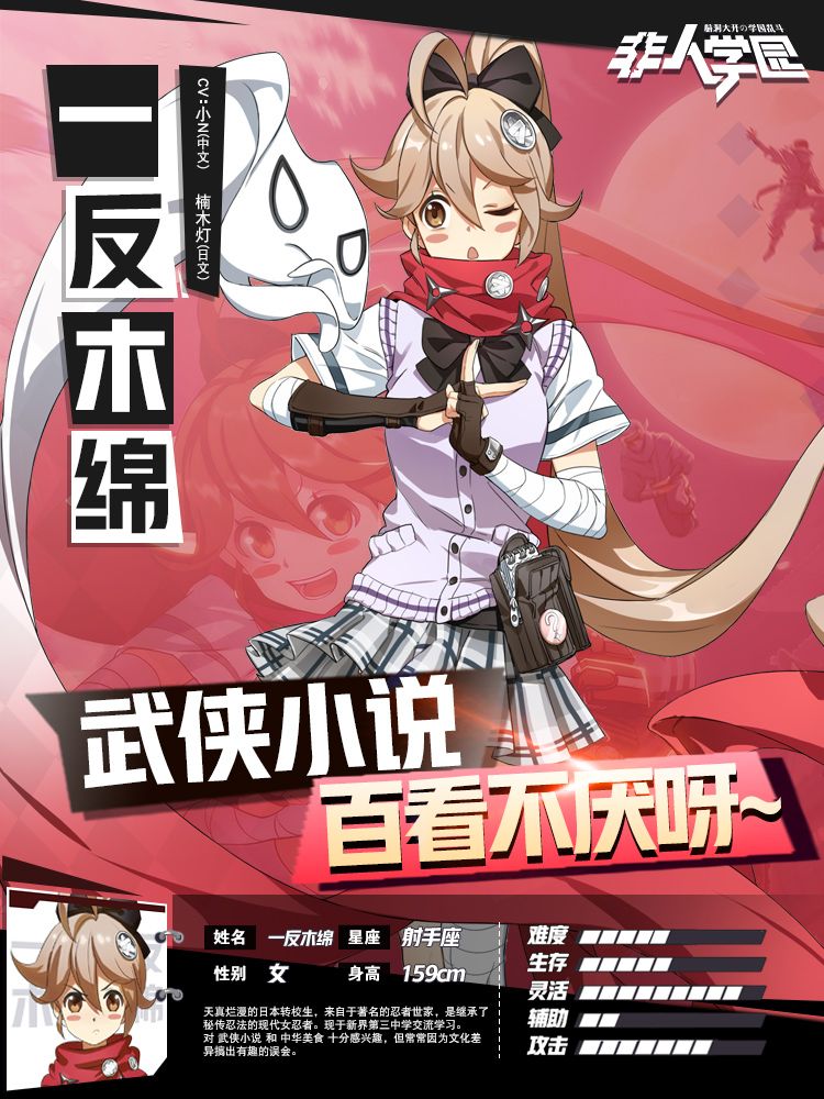 一反木绵是来自日本的转校生,拥有坚守忍道的本命忍兽“阿布”,是继承了秘传忍法的现代女忍者。虽然她在中文上下了一番苦工,但还是会时不时错用一些中国成语,而对一些奇怪的梗也没有抵抗力,常常会因为文化差异搞出有趣的矛盾,不过这丝毫不阻碍她对武侠小说和中华美食的狂热兴趣。