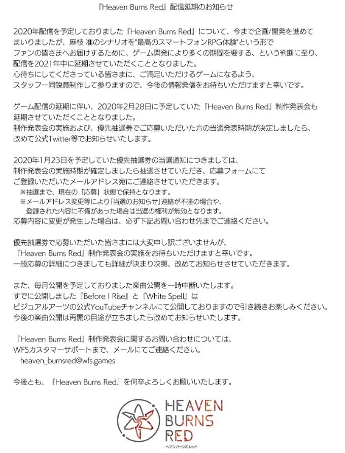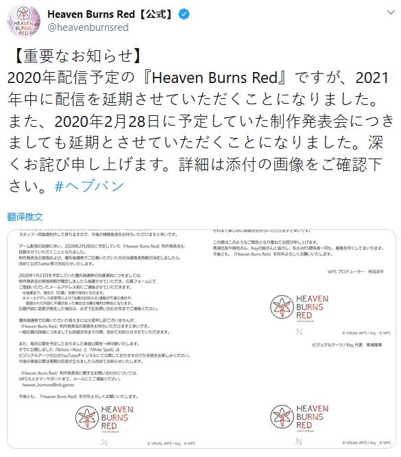 官方表示:“原定于2020年发售的《Heaven Burns Red》将延期至至2021年上市,与此同时,原定于2020年2月28日的发布会也已经被取消。我们对此深表歉意。”