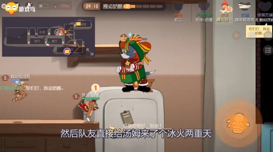 猫和老鼠手游这把运气不错呀,拿到三块经验蛋糕,开局先拿杂物间隐身然后去卧室推奶酪,推完直接5级,而猫才一级,这把有的玩了。有点尴尬哈,这就被抓了,然后队友直接给汤姆来了个冰火两重天,然后汤姆还一直开关冰箱,影响队友救人,然后杰瑞的这个鸟哨放得也不太好,到汤姆面前正好换方向,最后还是被队友救了。