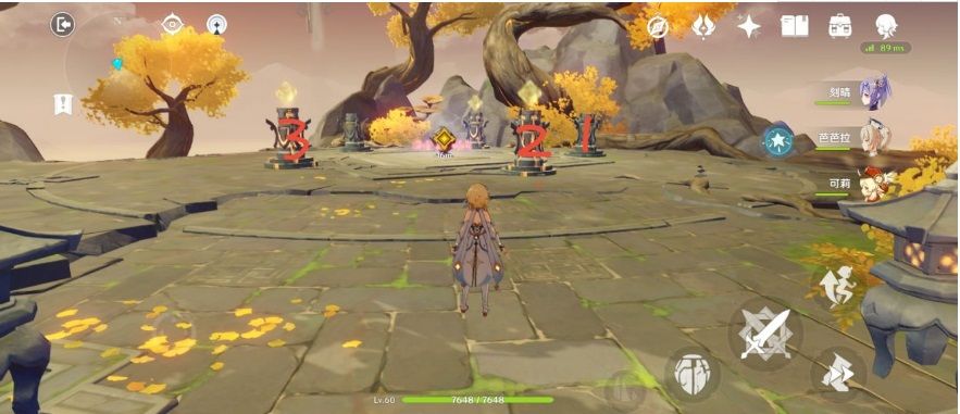 进入秘境后走上楼梯后会看到岩属性石柱有三个是点亮的。