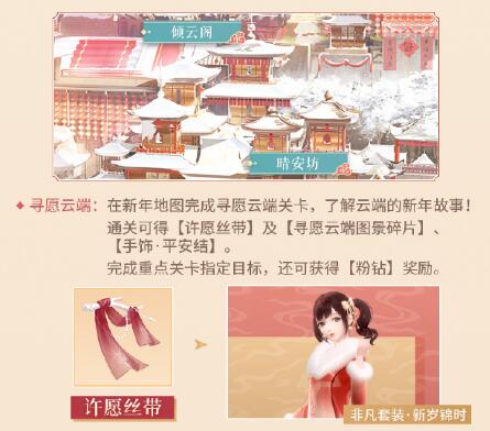 新岁将至,人们纷纷许下自己的新年愿望。新年主题活动“云景新愿”开启,玩家们可以探索云端城的新年故事,获得“心愿图景”碎片、“风息鹿铃”与“许愿丝带”奖励,使用“风息鹿铃”可在年货街兑换游戏内资源,累计相应数量的“许愿丝带”就可以免费获取新春套装“新岁锦时”。通关主线关卡等可获得神秘非凡印象等丰厚游戏资源奖励。