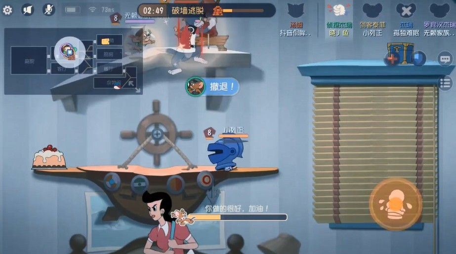 猫和老鼠手游这次4黑碰到个猫贼凶,一个机械鼠没有打爆的情况下,开局就绑了一个,因为玩的奶酪位没怎么正面和猫对,但是推两个奶酪的机会,队友两个人换着上火箭,看的出来这猫技术应该还不错。2分多钟,如果单单开奶酪的话,只有两块进洞,老鼠一点优势没有,但是看小地图,罗宾汉旁边有奶酪,我这边有一块奶酪,只要需要一波进洞,猫根本反应不过来的,加上队友还没有放飞,等级肯定是我我们压制,等4块奶酪进洞,铁头娃技能好了一波救人。