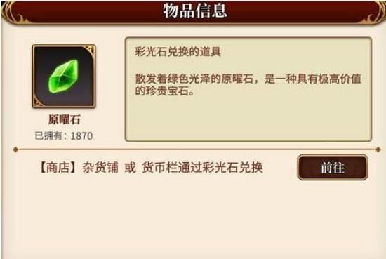 彩光石,主要靠推图得,或者用真money换。能够购买原耀石、礼包、体力瓶子等。
