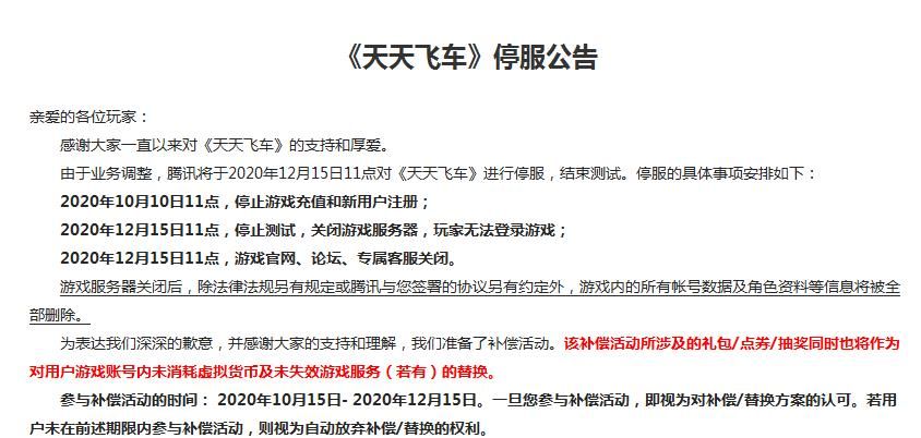 腾讯旗下竞速手游《天天飞车》官方网站发布公告,宣布由于业务调整,腾讯将于2020年12月15日11点对《天天飞车》进行停服,结束测试。公告中表示,游戏服务器关闭后,除法律法规另有规定或腾讯与您签署的协议另有约定外,游戏内的所有帐号数据及角色资料等信息将被全部删除。同时官方也公布了补偿活动。