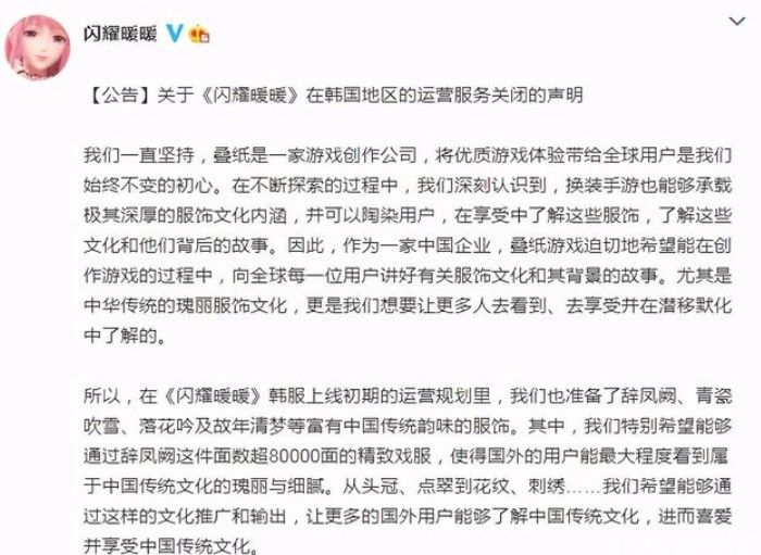 因此,我们郑重决定关闭《闪耀暖暖》在韩国地区的运营服务。