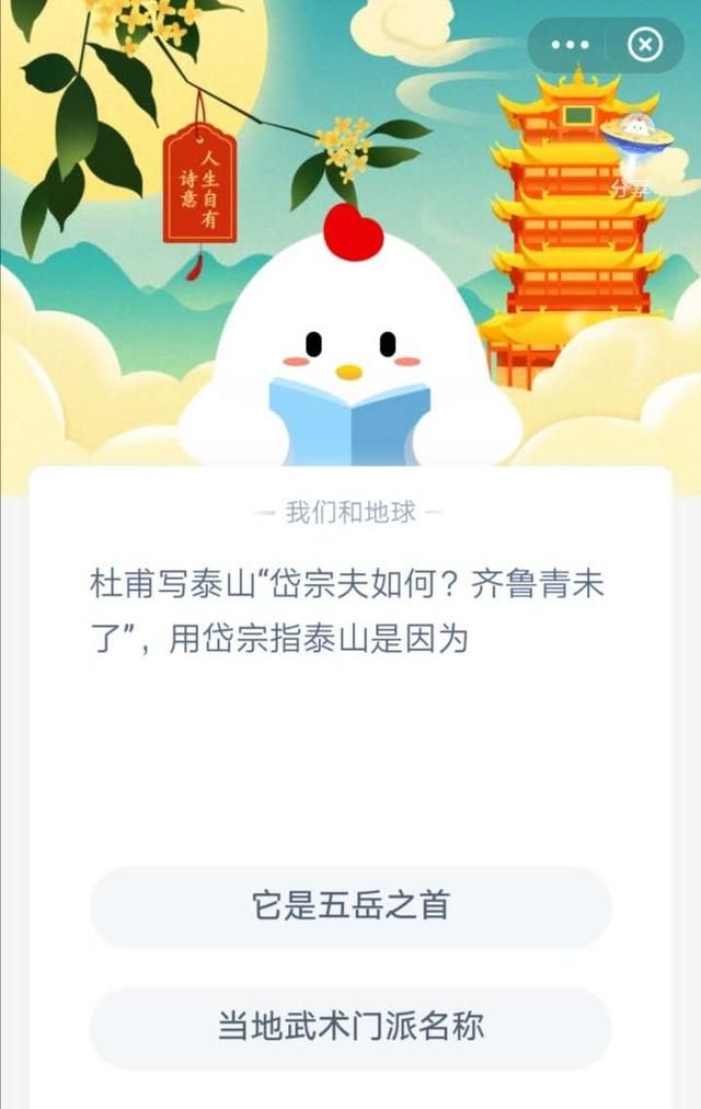 支付宝蚂蚁庄园的蚂蚁小课堂又开课啦!今天问了一句诗,岱宗夫如何?齐鲁青未了”,用岱宗指泰山是为什么?泰山在中国古代的地位都非常高。历代的帝王都要拜祭泰山。到现在提起中国的山必然会想到泰山。下面就来告诉大家问题中的答案。