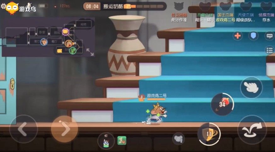 等了一会队友将我救下,先吃点东西再去救人吧,等我吃完之后这猫居然又来了,我实在是太难了。追了我十八条街,还好逃脱了,但是队友又被抓了,此时看看我身上的buff,被恐吓了,推奶酪是不可能了赶紧去救人吧,没成想猫居然又来抓我了,还好我一个护盾躲过去致命一爪,我在溜猫的时候,队友也不说赶紧去救人,亏得我溜半天。这个时候天使去救人了,火箭只有十秒钟,天使到底能否将人救下呢?