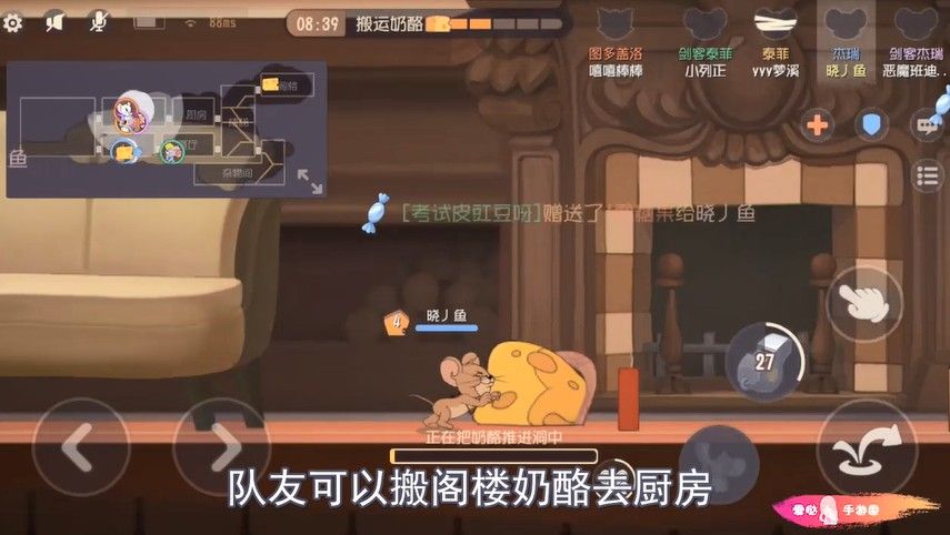 2级被动的杰瑞,有个优势就是想去哪里就去哪里,搬运奶酪到处跑,配合看小地图基本上奶酪到手,很稳都能推进去了,这个“餐厅”的奶酪如果就在餐厅推,加上猫还在厨房,加入硬推的话,很容易给猫刷等级的,如果这个奶酪去“客厅”猫未必会过来,如果过来队友可以搬阁楼奶酪去厨房,这样的“游击战术”,面对图多盖洛还是比较厉害的。
