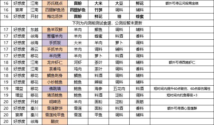 四、16-20级菜谱材料一览