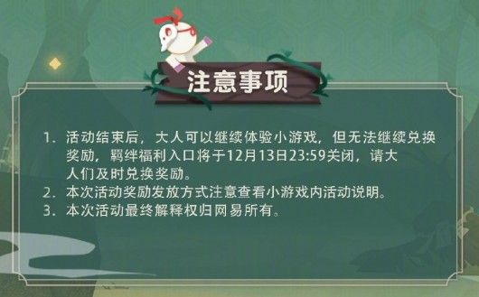1.活动时间:2020年11月25日维护后-2020年12月13日23:59,活动结束后,排行榜将会保留,大人可以继续体验小游戏。