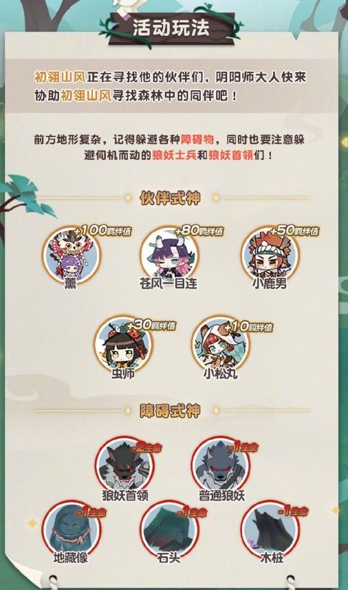 4.不同的伙伴式神会给大人带来不同的羁绊值,狼妖、狼妖首领和障碍物也会带来不同的伤害;