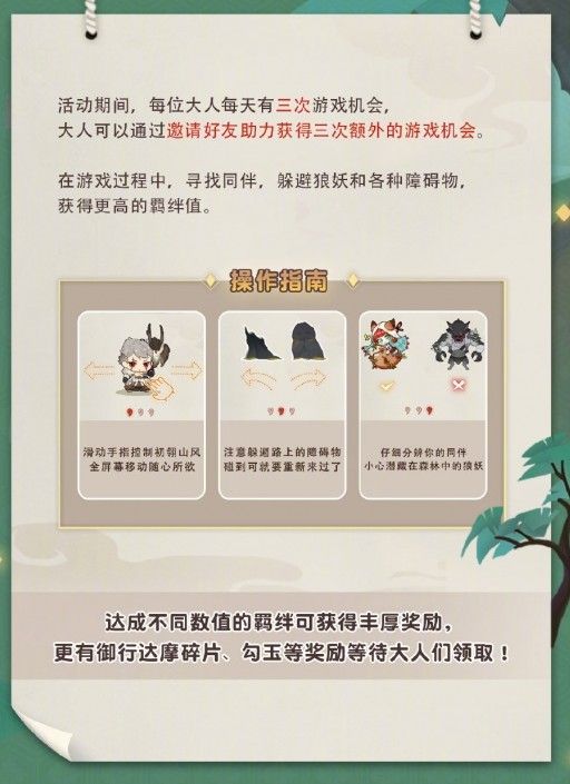3.在闯关过程中,大人需要躲避狼妖和各种障碍物,寻找同伴以获得更高的羁绊值:每次闯关共有三点生命值,碰撞到狼妖、狼妖首领和障碍物时会扣除对应点数的生命值,当初翎山风的生命值归零时,游戏结束;