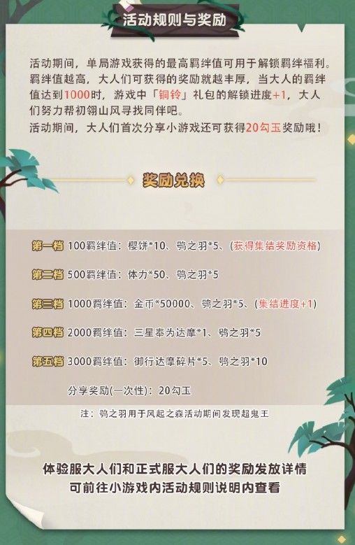 成功绑定游戏账号的大人们,可根据个人最高羁绊值获得御行达摩碎片、超鬼王专属活动道具鸮之羽等丰厚奖励;