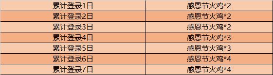 累计登陆7天分别可以领取2、2、2、3、3、4、4个火鸡,加起来一共可以获得20个火鸡。