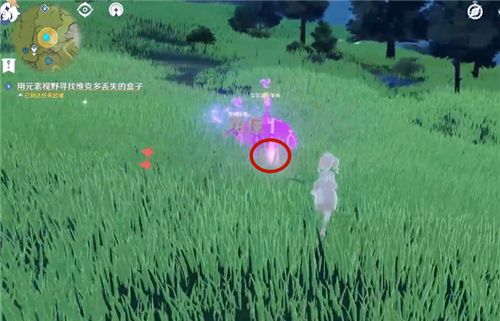 第三步:找到第二个雷元素痕迹后,走到黄圈的中心靠近雷史莱姆,最后一个线索就在这里。(PS:不仔细看就是和史莱姆融为一体)最后就能获得维克多丢失的盒子了,回去将其提交给维克多NPC即可。
