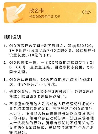 3、QID 确认设置后 , 30 天内仅能使用改名卡修改 1 次,非 SVIP 用户不可修改。