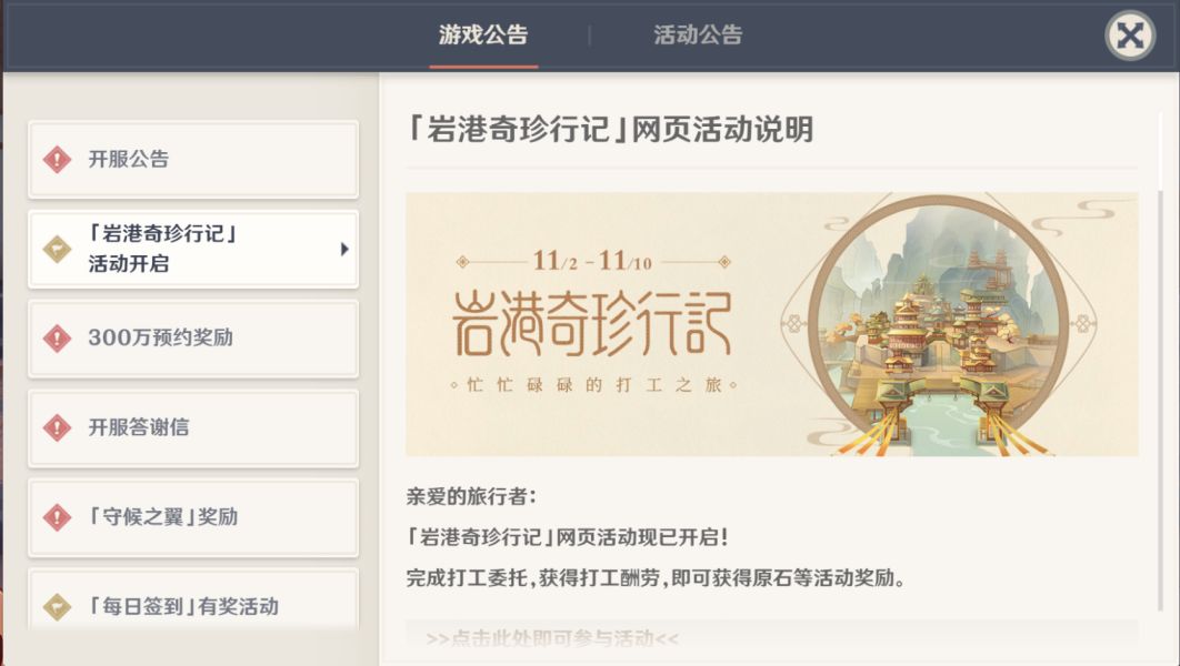 原神岩港奇珍行记玩法活动怎么参加?如何完成岩港奇珍行记的内容?原神在今天又开启了一个新的活动。每一位玩家化身为打工人。在游戏中四处寻找工场打工。完成打工内容后会获得酬劳跟奖励。下面就来告诉大家快速玩法任务的方法。