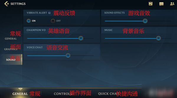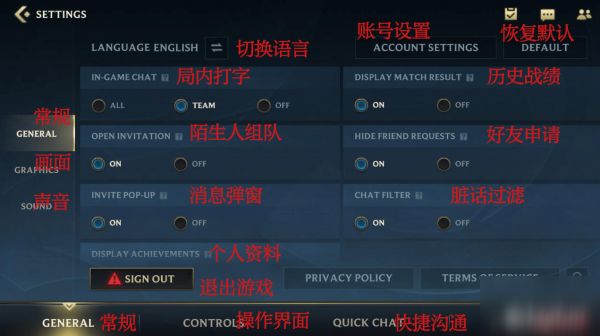 "SETTINGS"页面中可以分出四个部分,常规、操作界面、快捷沟通和黑名单。先来说说"常规"的页面。常规页面也分成了三个部分,常规、画面和声音。