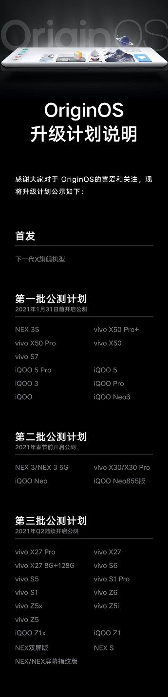 OriginOS 将在下一代 X 旗舰机型上首发。之后,第一批升级计划机型包括 X50、NEX 3S、iQOO5 等十余款机型,时间为 2021 年 1 月 31 日之前。第二批升级机型包括 X30、NEX 3、iQOO Neo 等更多机型,时间为春节前,其他机型升级计划后续将会陆续推出。