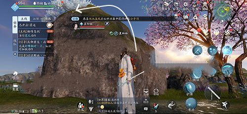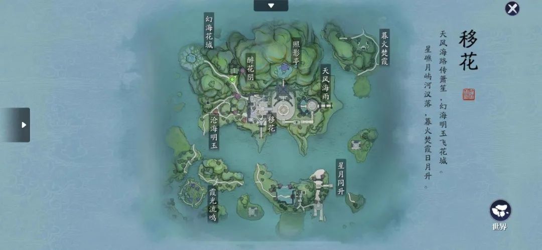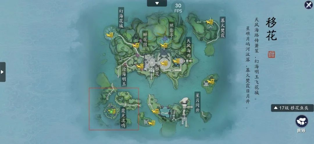 这个传音蛊的位置,就是在移花的左下角,就是霞光流鸣这个地方,玩家可以来到红框这个区域。