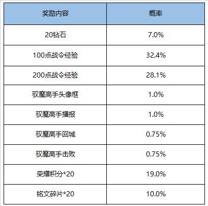 打开可随机获得以下奖励之一:驭魔高手头像框、驭魔高手荣耀播报(永久)、驭魔高手回城(永久)、驭魔高手击败(永久)、荣耀积分*20、100/200战令经验、钻石*20、铭文碎片*20。