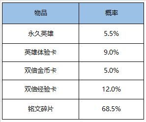 打开后可随机获得以下奖励之一:吕布、貂蝉、李元芳、英雄体验卡3天、双倍金币卡:1日、双倍经验卡:1日、188/138/108铭文碎片。
