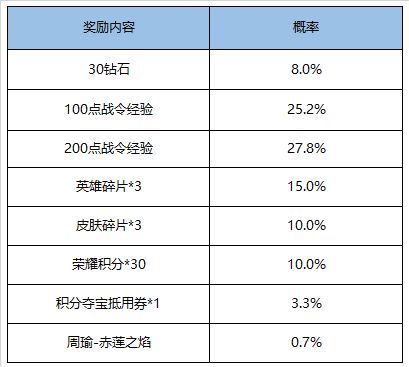 打开可随机获得以下奖励之一:周瑜-赤莲之焰、积分夺宝抵用券*1、英雄碎片*3、皮肤碎片*3、荣耀积分*30、100/200战令经验、钻石*30。