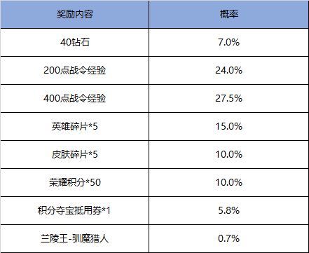 打开可随机获得以下奖励之一:兰陵王-驯魔猎人、积分夺宝抵用券*1、英雄碎片*5、皮肤碎片*5、荣耀积分*50、200/400战令经验、钻石*40。