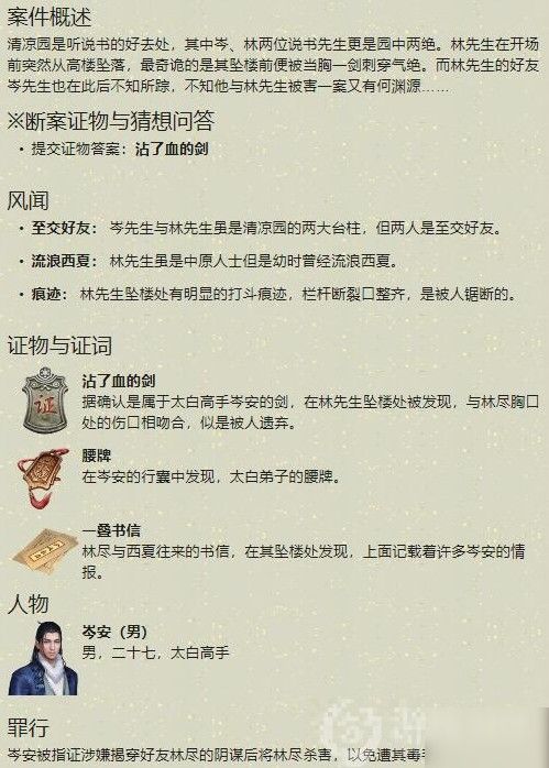 天涯明月刀手游岺安案件攻略:岑安案件证据破案流程详解