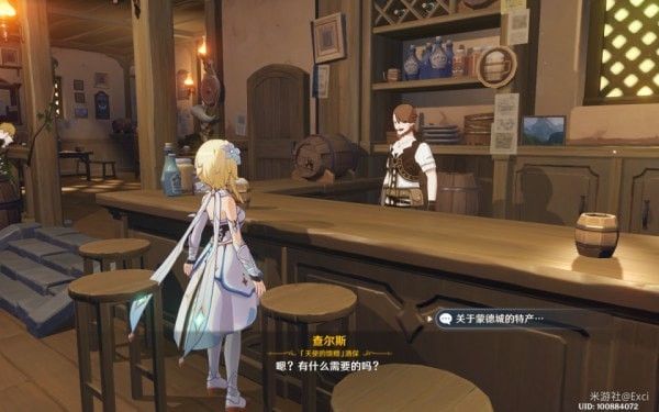 店主两个问题,其一:蒲公英是不是花?答:是花。随后去酒馆和酒保查尔斯对话,你将依其安排取东西后收到查尔斯的特色调味酒。