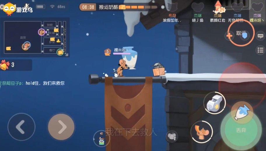 队友才刚被抓,不急着救人,还是先推掉奶酪,看到超豆子跳下去后,我决定观望一下,如果他被抓了我在下去也吧,这绝对不是我胆小啊。餐厅奶酪被推掉后队友也被救了,双喜临门呀,我突然发现奶酪只剩一块了,这也太快了吧,但是素颜没跑掉,被黑鼠抓到了侍卫房,然后这个超豆子没就到人,自己也被抓了。