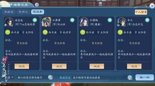 加入影宗看更广的江湖只是开始,《新笑傲江湖》手游师徒系统也将让你的江湖路更加真实!在《新笑傲江湖》手游中,每一个玩家都可以自由的开创或加入师门扮演心中想要的角色。成为师傅广招贤徒,像五岳剑派掌门那样将毕生所学以传道方式授出,成为江湖最闪耀的门派;或加入师门跟随师父,领悟独特且博大的门派文化,让自己的江湖生活更加精彩。