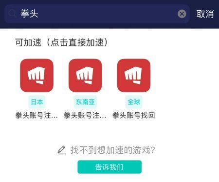 1、进入提速软件后,点击底部“游戏”按钮,右上角搜索游戏“拳头”,选择自己想要注册的地区,然后进行提速。