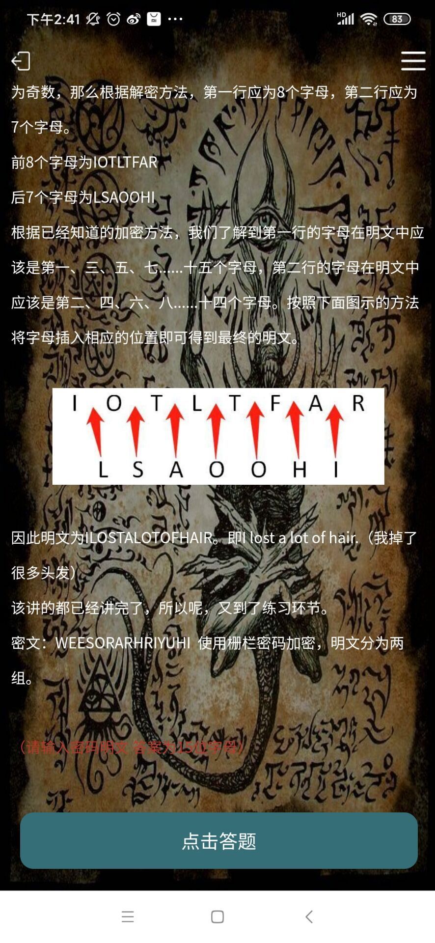 为奇数,那么根据解密方法,第一行应为8个字母,第二行应为7个字母。