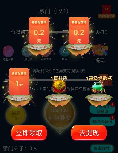 宗门异变的话,静态玩家也是可以玩的,看视频可以获得贡献值、等级提升也可以获得贡献值。今天异变了一次获得1.4元奖励,直接提出了秒到账。