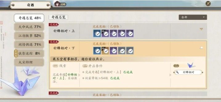 开启侠客:要解锁侠客叶知秋,需要完成针锋相对·上/下奇遇,奇遇自动触发,跟着跑即可;