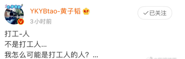 事情是这样子的剧组有人调侃黄子韬是勤劳的“打工人”,黄子韬本人看了以后竟然理解成为”打—工人“。就这样成为很多网友的笑点。也加速了这个”梗“的发酵。