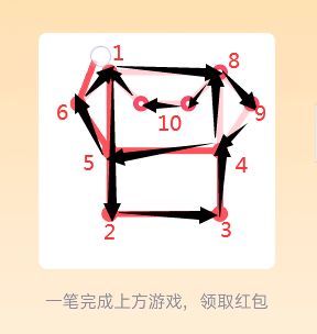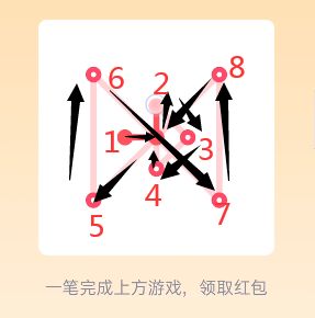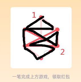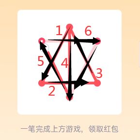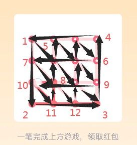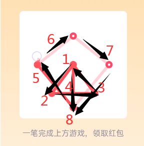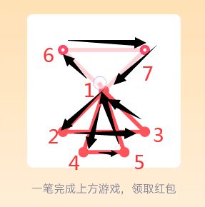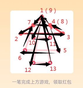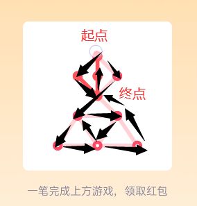 18、先在图形中寻找奇数点(即有3、5、7等奇数条线相连的点),分别设置为起点和终点,由起点开始,按照“Z”字形向下延伸,然后再把左侧的线全部连上,一直连到起点,最后按照从上到下的顺序,一直画到终点即可,点击“开”即可领红包。