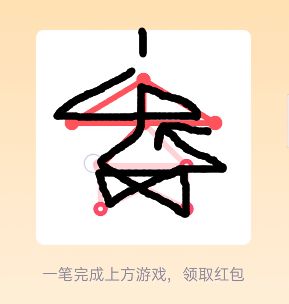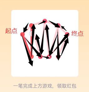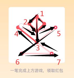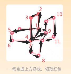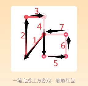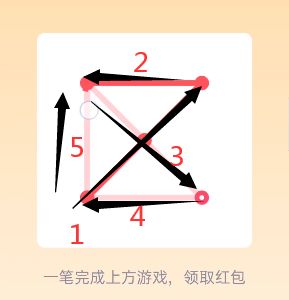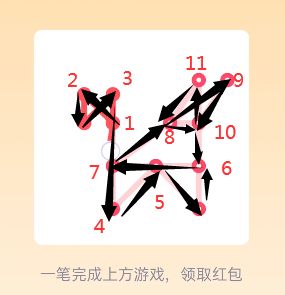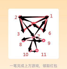 25。打开好友发送的一笔画红包进入【25关】一笔画,查看【25关】图形找到图形中的【奇点】【注:只有两个可以一笔画完】,设置一个奇点为画图的出发点另一个奇点为终点,采用【之】字结构从右侧一边画起往左侧延伸,根据【之】字走向到达左上角最后一个奇点位置。