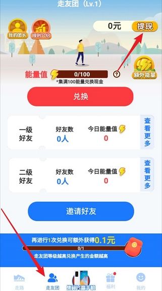 点击下面的『走友团』可进入类似山海经模式的功能页面,每天看视频可获得能量奖励,100能量抽一次奖。从下面的保底红包来看,奖励不是太大。
