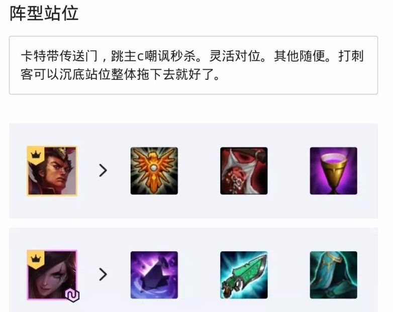 五、站位分析:卡特带传送门,跳主C嘲讽秒杀,灵活对位,其他随便,打刺客可以沉底站位,整体拖下去就好了