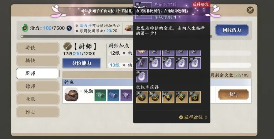 通过采集各种食材烹饪食物,食用给予增益buff,属性很可观。没周提交食材或食物给帮派会最多可获取帮贡1400点和修为490W,这是一个极其可观的数字,也是一定要学习的身份,没有之一。 文士:仅男角色可选择。主要以笛谱给予队伍增益buff,主要笛谱为水云游,月中桂,侠客行,西江月,无痕,余音。可以创作书画抄本,书画也是修为主要来源之一,前期最赚钱身份之一。