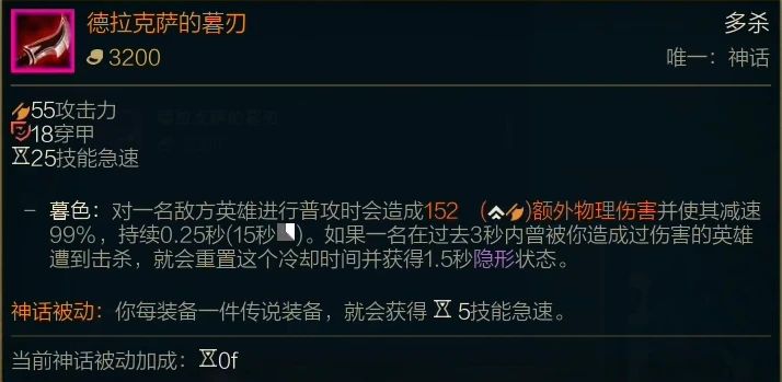 幕刃这件装备在S11迎来了史诗级增强,不仅可以获得大量的冷却缩减,在击杀了敌方英雄之后还会获得1.5秒的隐身。螳螂、狮子狗、男刀都可以在下个赛季重新启用了。
