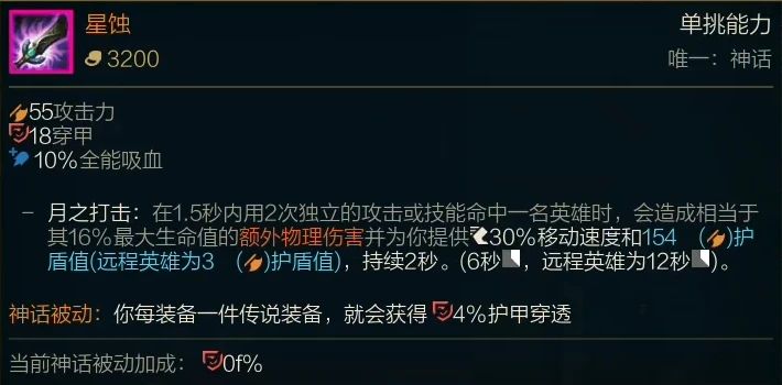 星蚀的额外16%最大生命值伤害和30%的移速对于剑姬等近战英雄来说是一件必出的换血神装。我打你一套特别疼,打完就跑你也追不上。就算你手长一点用技能甩到我,连我的护盾都没打掉。基本上有了这件装备上路就会经常性的爆发战斗。