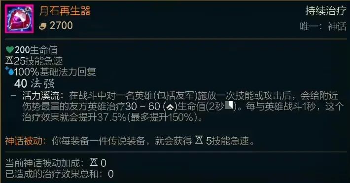 月石再生器,在最近一次美测服的改动中增加了40点的法术强度,生命值加成也从150改为了200.如果有英雄联盟骨灰级老玩家就可以认出来这件装备在远古版本叫做伊丽莎白的奇迹石,效果是升三级会转换成英雄的永久属性并且还不占装备栏。