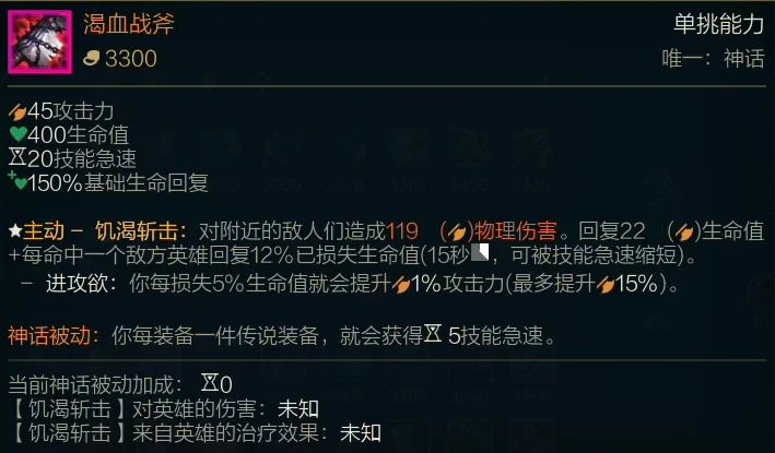 渴血战斧,人人都是诺手。从此以后大杀四方不再是诺手和莉莉娅的专属技能了,虽然这个饥渴斩击的范围没有诺手的Q技能那么大,但是这个技能没有内圈外圈的区分,只要在圈里有敌方英雄就会给我们回复生命值。