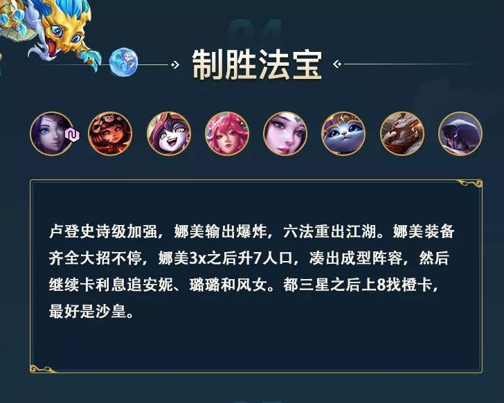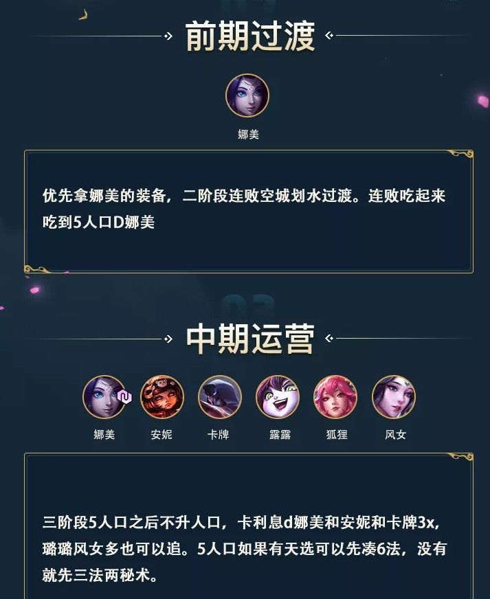 6法在这个版本得到了20%的加强,现在就算是双龙也挡不住六法了,九法就先别想了,我们做到六法再说吧。剑魔大哥一剑砸下去对面非死即残,龙王再补上一口。节奏方面开局拿铲子>大剑>大棒。2-1升4人口,推荐骑士+刺客,2-4升5人口,推荐骑士+冰女+刺客,冰女可以用剑魔装备打工,法师牌只留剑魔和小法。3-3升6人口,打完狼升7人口后开始D牌,剑魔、璐璐、小法、莫甘娜到两星基本开始锁血。
