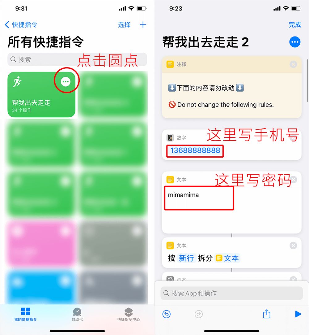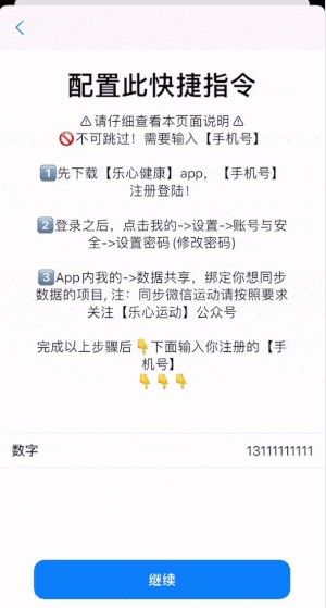 5.添加快捷指令时,请在对应位置填写乐心健康的手机号、密码。